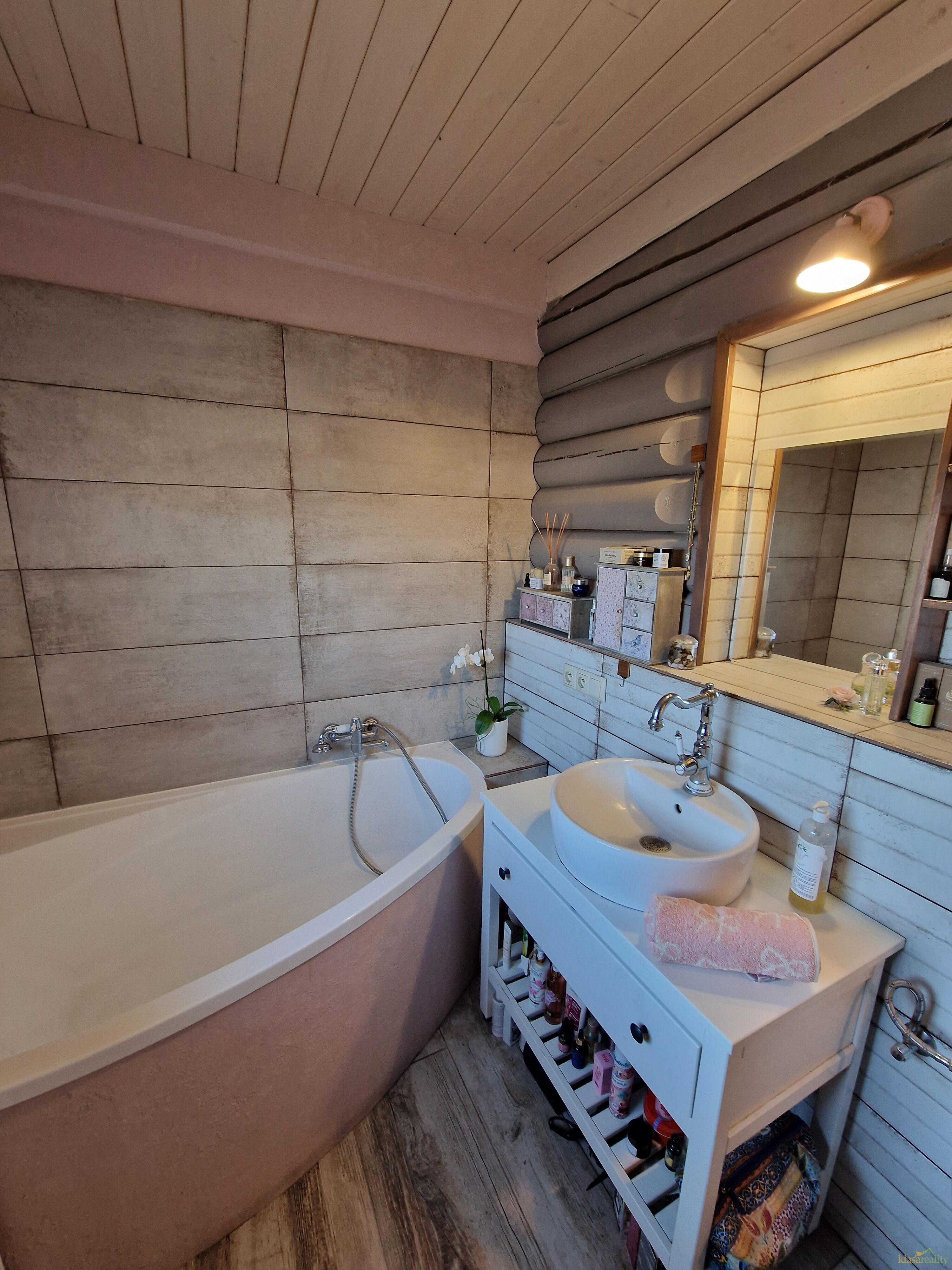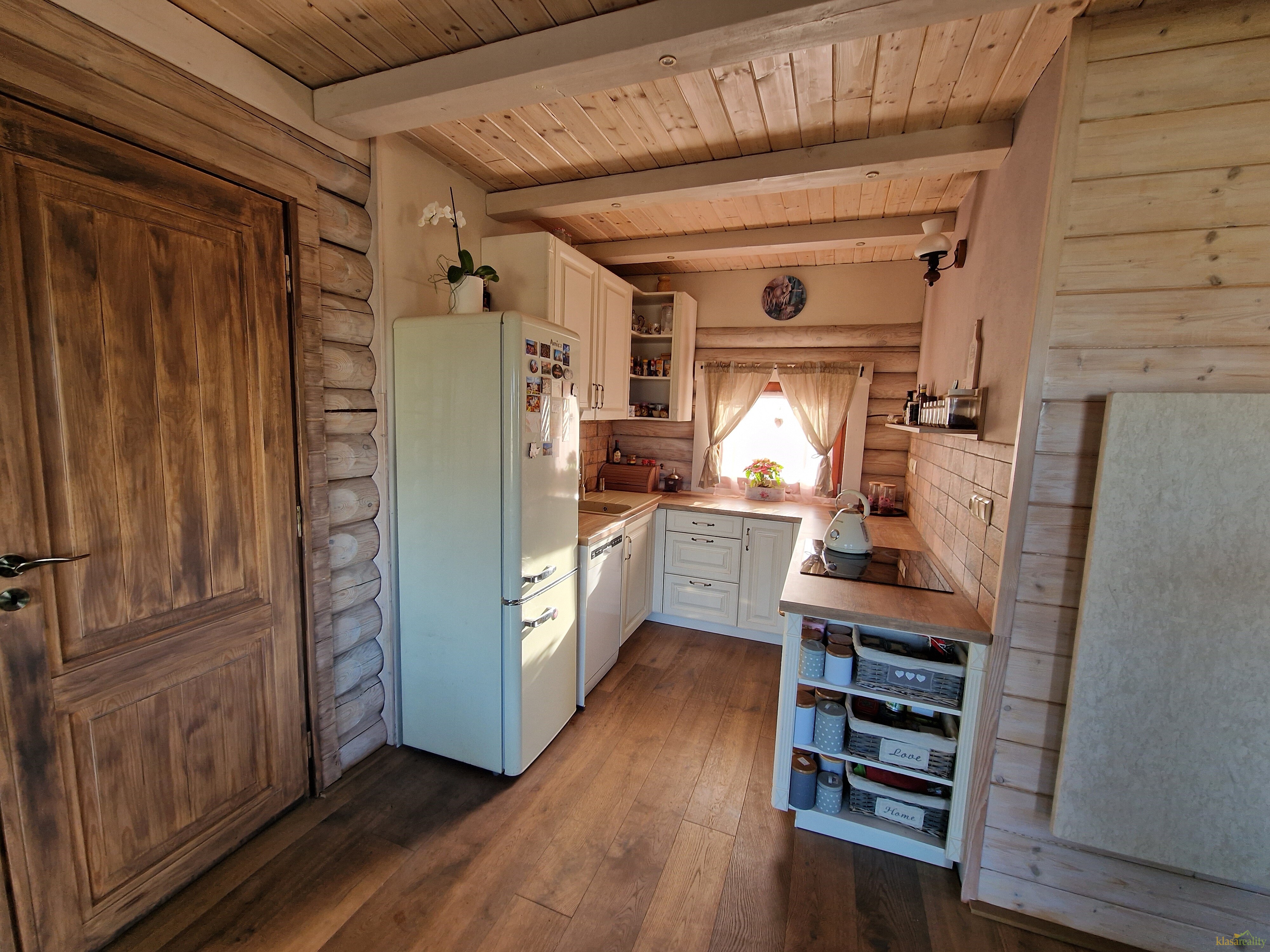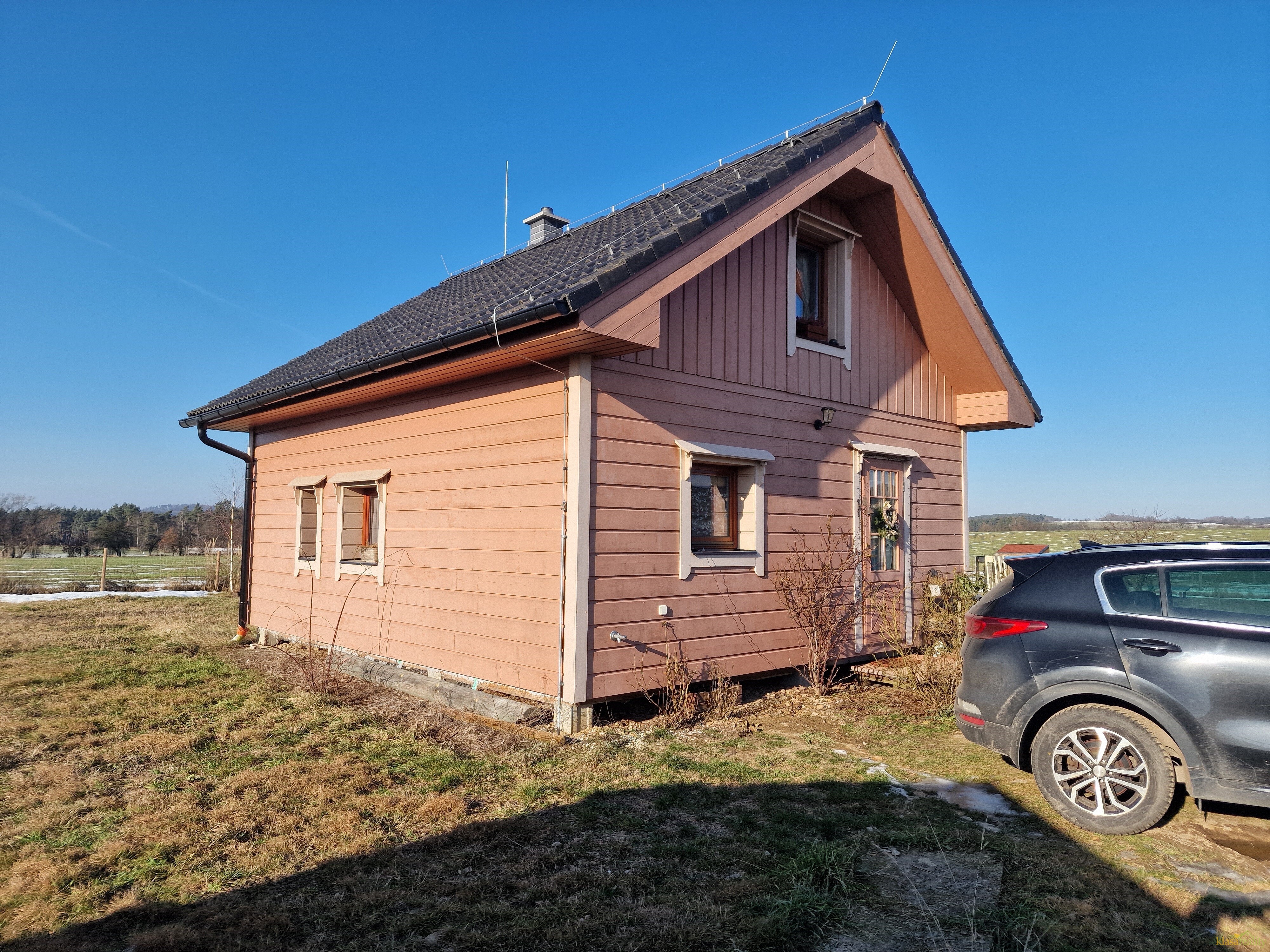 Stylová novostavba finského srubového domu se nachází na klidném místě obce. Nabízí útulné a promyšlené zázemí, kdy v přízemí najdete vstupní chodbu, šatnu, koupelnu s vanou a WC, kuchyňský kout zařízený kuchyňskou linkou v provensálském stylu, jídelní prostor, pracovnu a obytný prostor kde jeho dominantou jsou krásná kachlová kamna. Z obytného pokoje je vstup na zahradu. Dřevěným schodištěm se dostaneme do podkroví, kde je ložnice a relaxační místnost.
