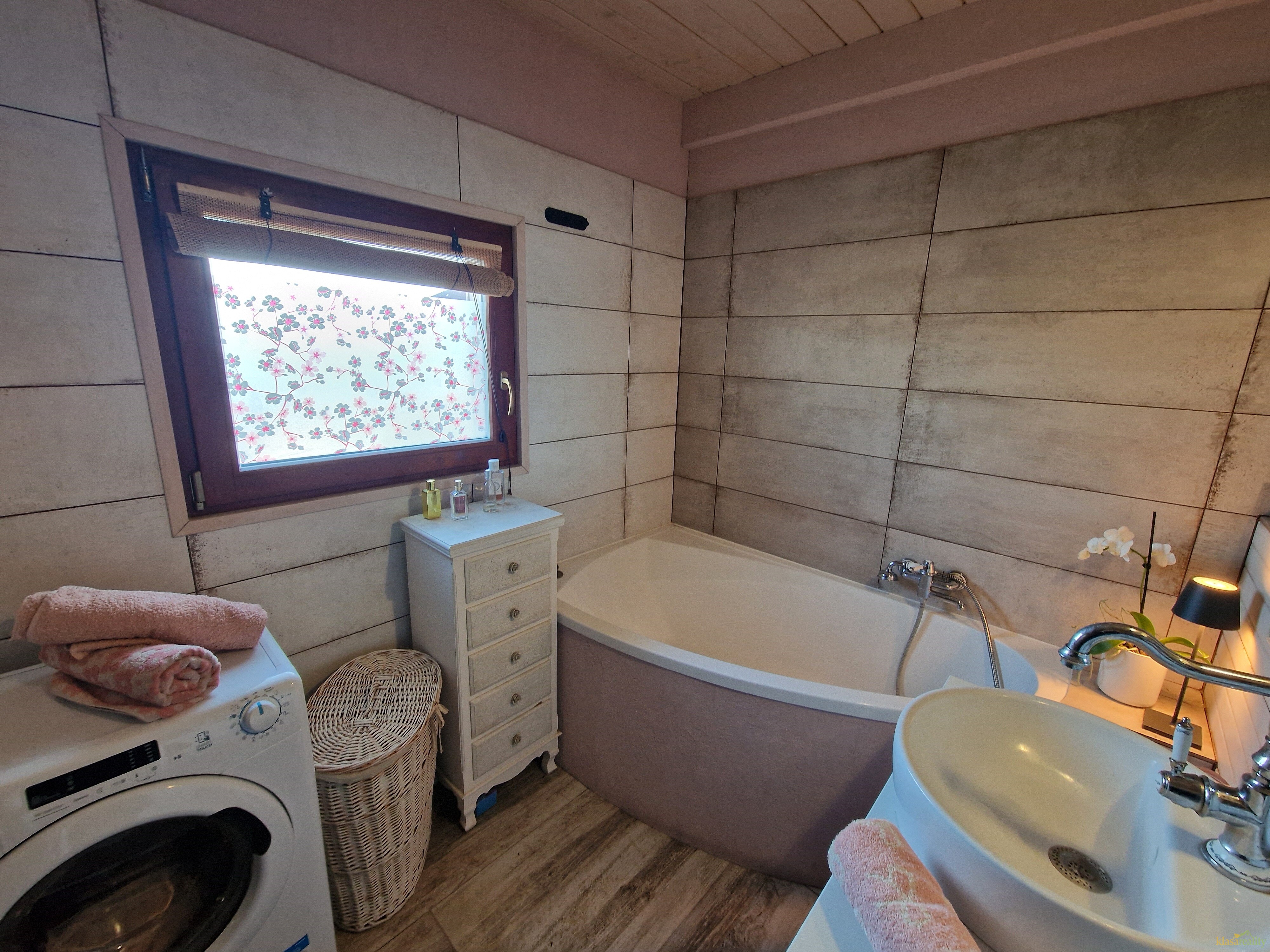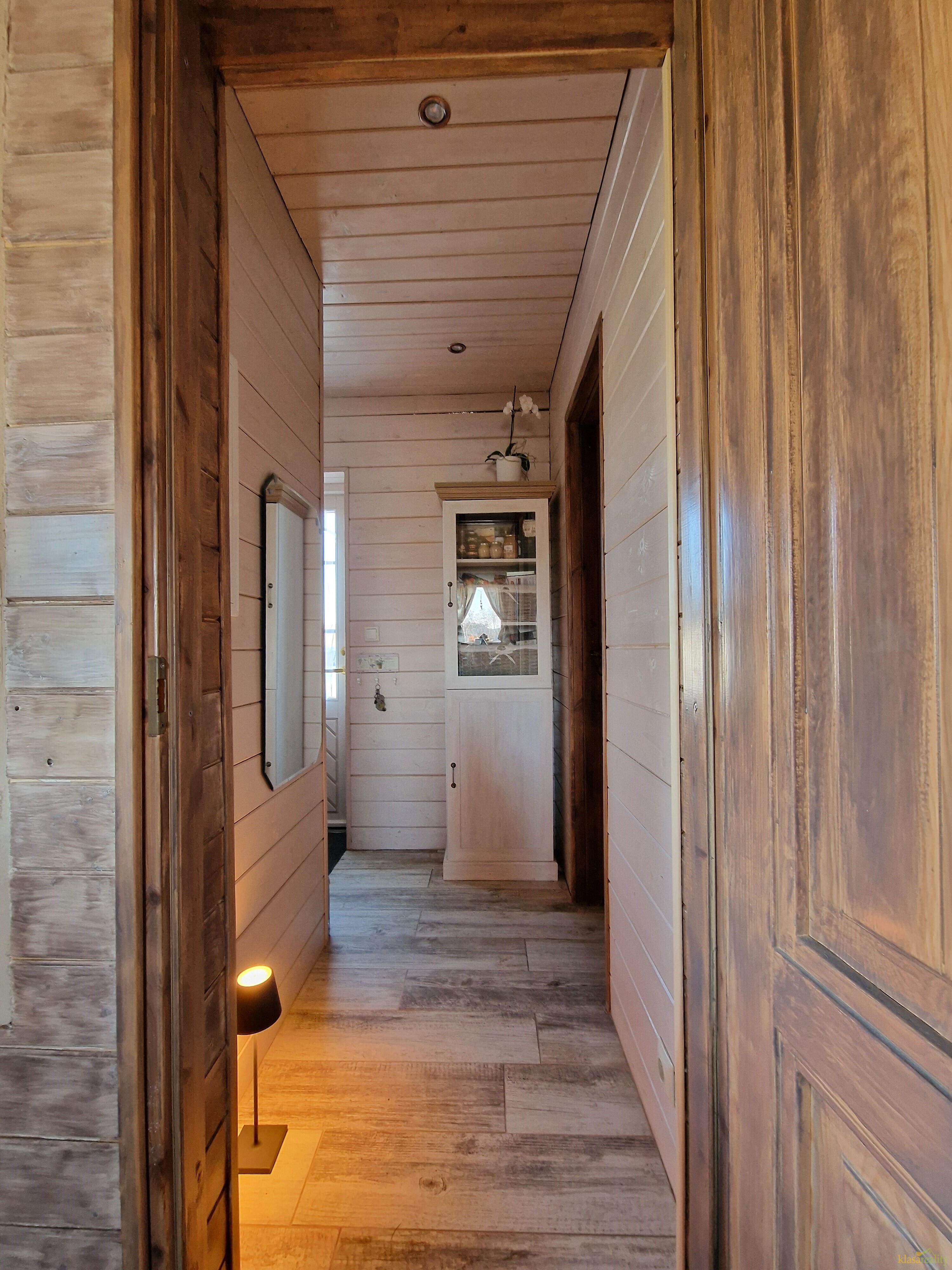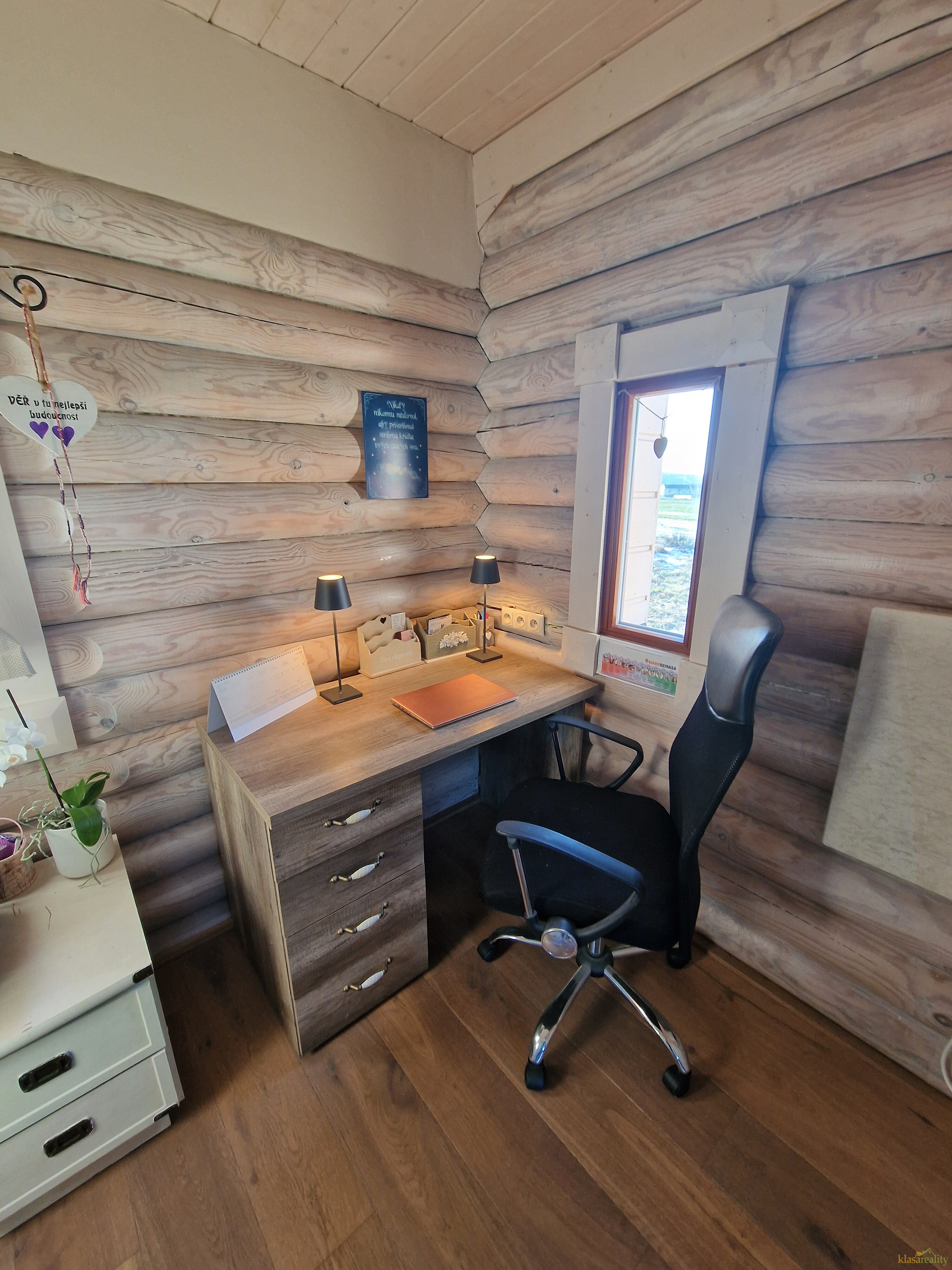 Stylová novostavba finského srubového domu se nachází na klidném místě obce. Nabízí útulné a promyšlené zázemí, kdy v přízemí najdete vstupní chodbu, šatnu, koupelnu s vanou a WC, kuchyňský kout zařízený kuchyňskou linkou v provensálském stylu, jídelní prostor, pracovnu a obytný prostor kde jeho dominantou jsou krásná kachlová kamna. Z obytného pokoje je vstup na zahradu. Dřevěným schodištěm se dostaneme do podkroví, kde je ložnice a relaxační místnost.